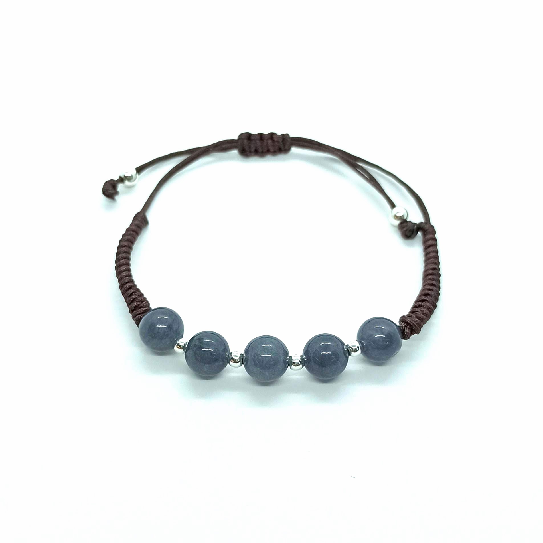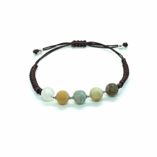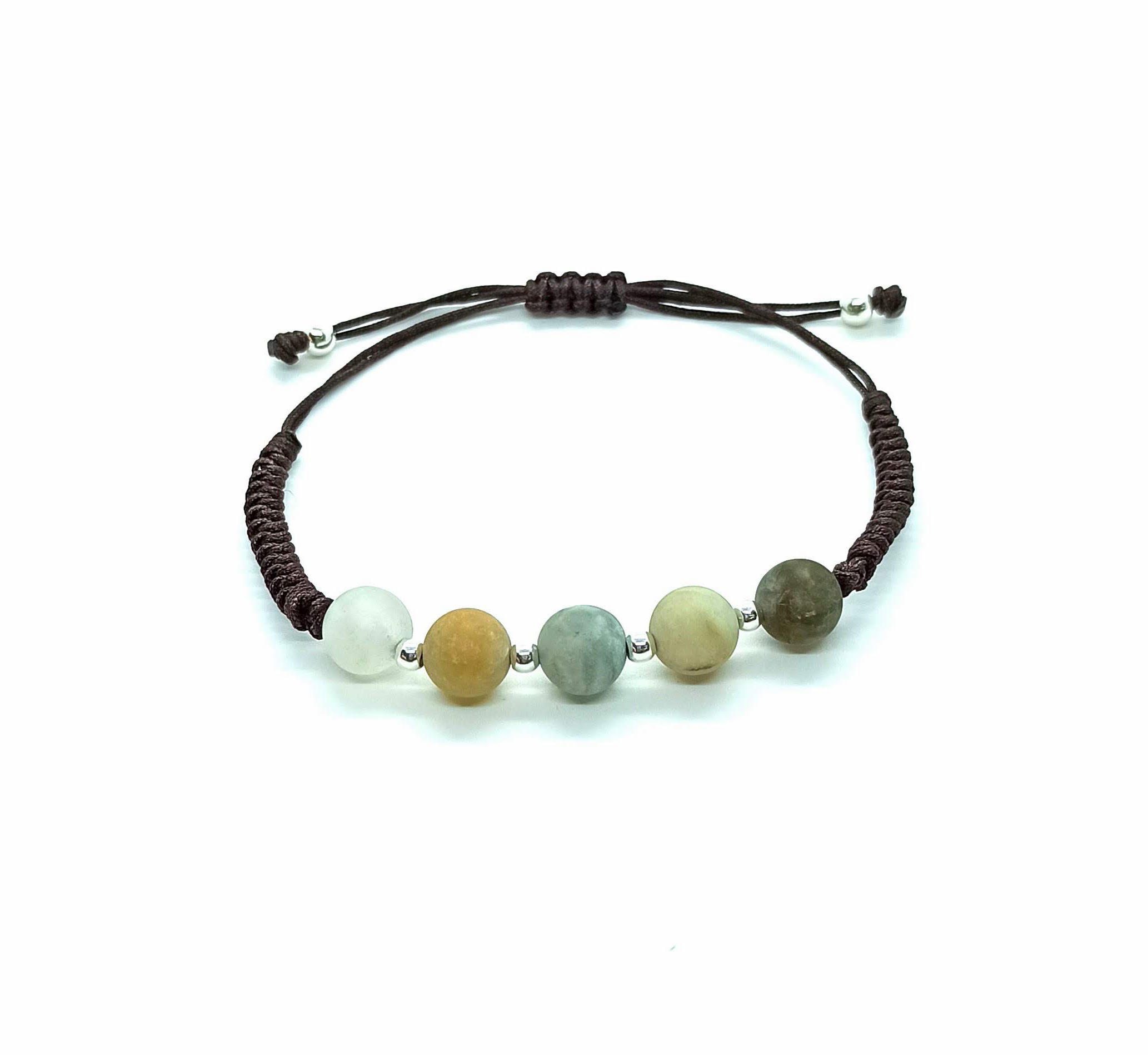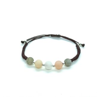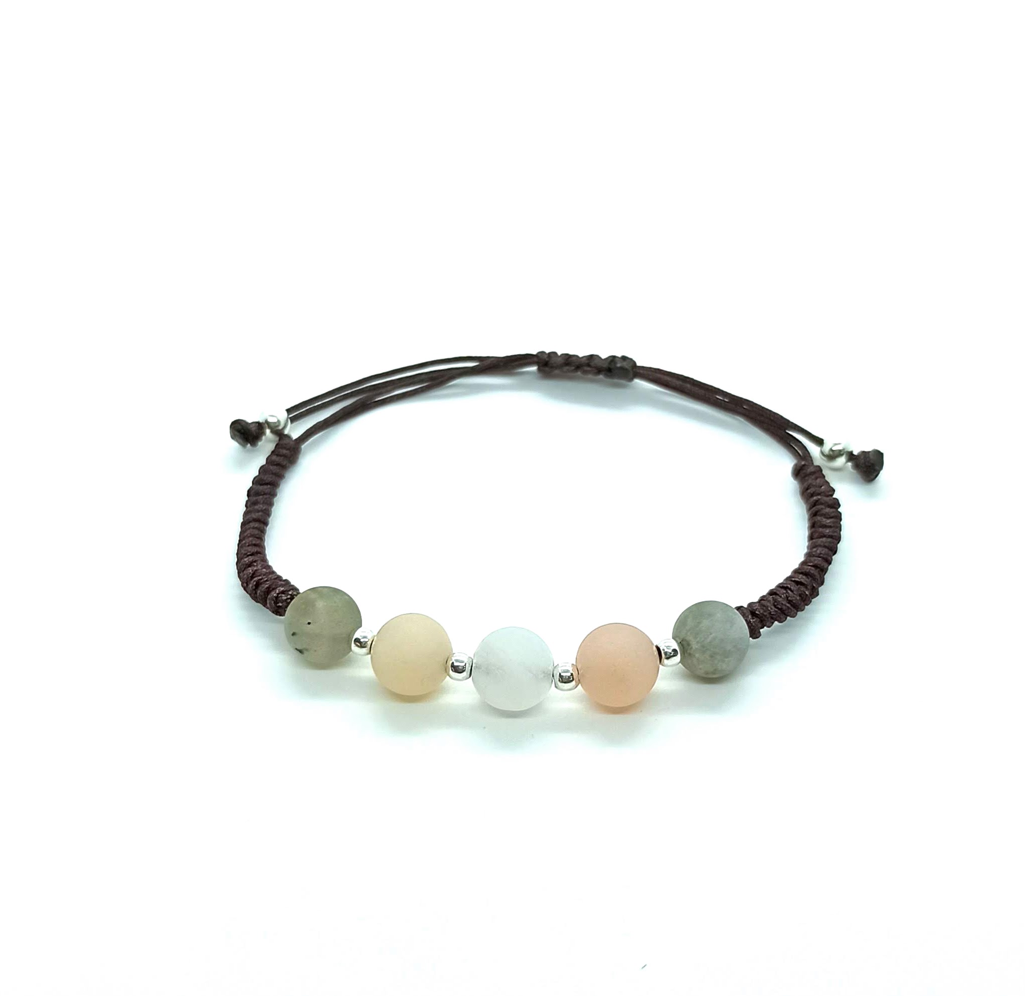 Pulseras de Piedras, enfiladas en hilo marrón con nudos serpiente. En el centro 5 piedras naturales redondas de 0.8 mm. aprox. intercaladas con 4 Bolas de 3 mm. de Plata 925. Cierre con nudos macramé. Acabadas al final de cada hilo con 1 Bola de 4 mm. de Plata 925. Disponible en distintas piedras: Ágata iris, Ágata rosa, Turmalina negra, Ojo de tigre, Cuarzo rutilado, Lapislázuli, Amazonita y Piedra luna. ¡Escoge la que más te guste!