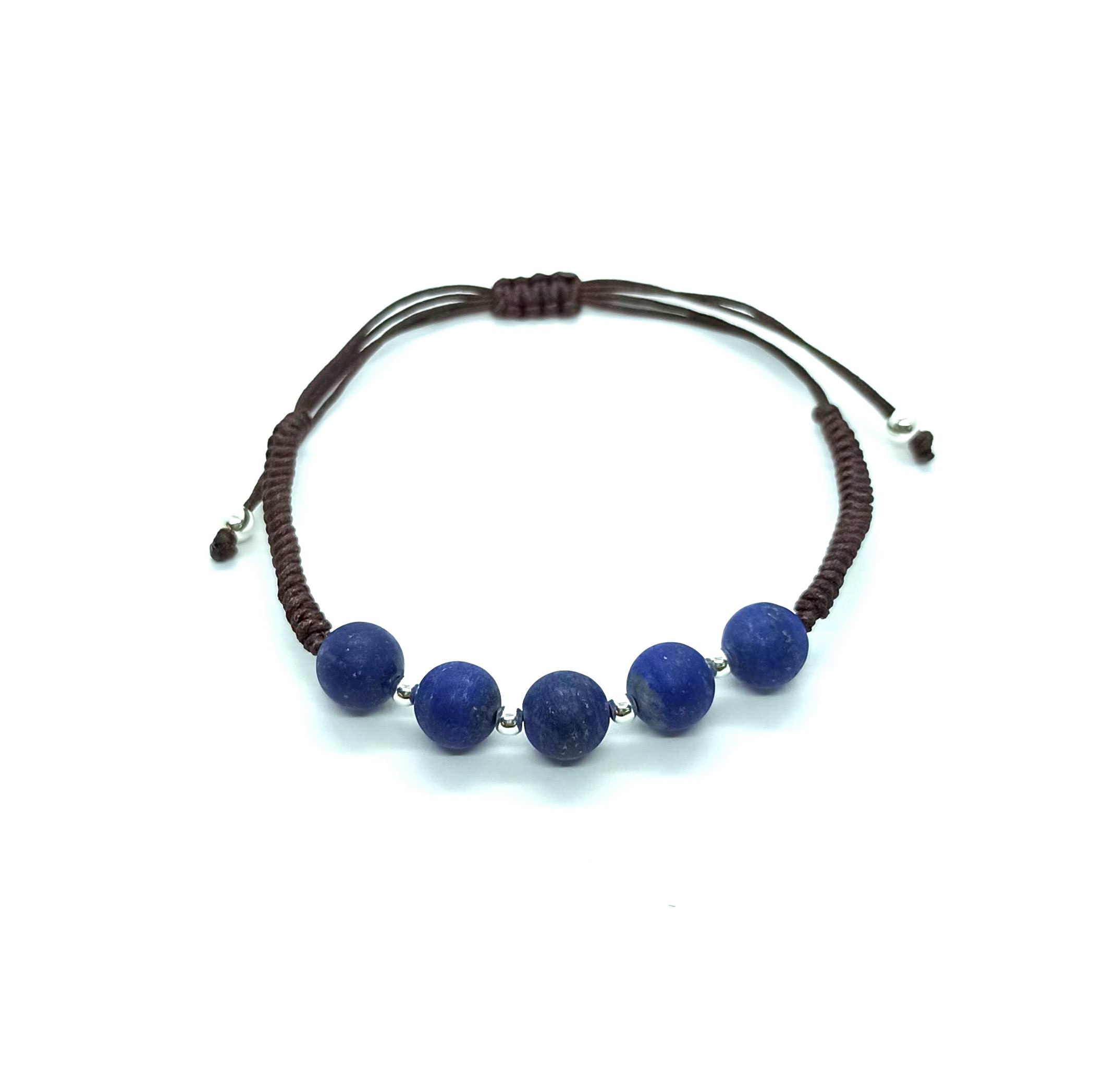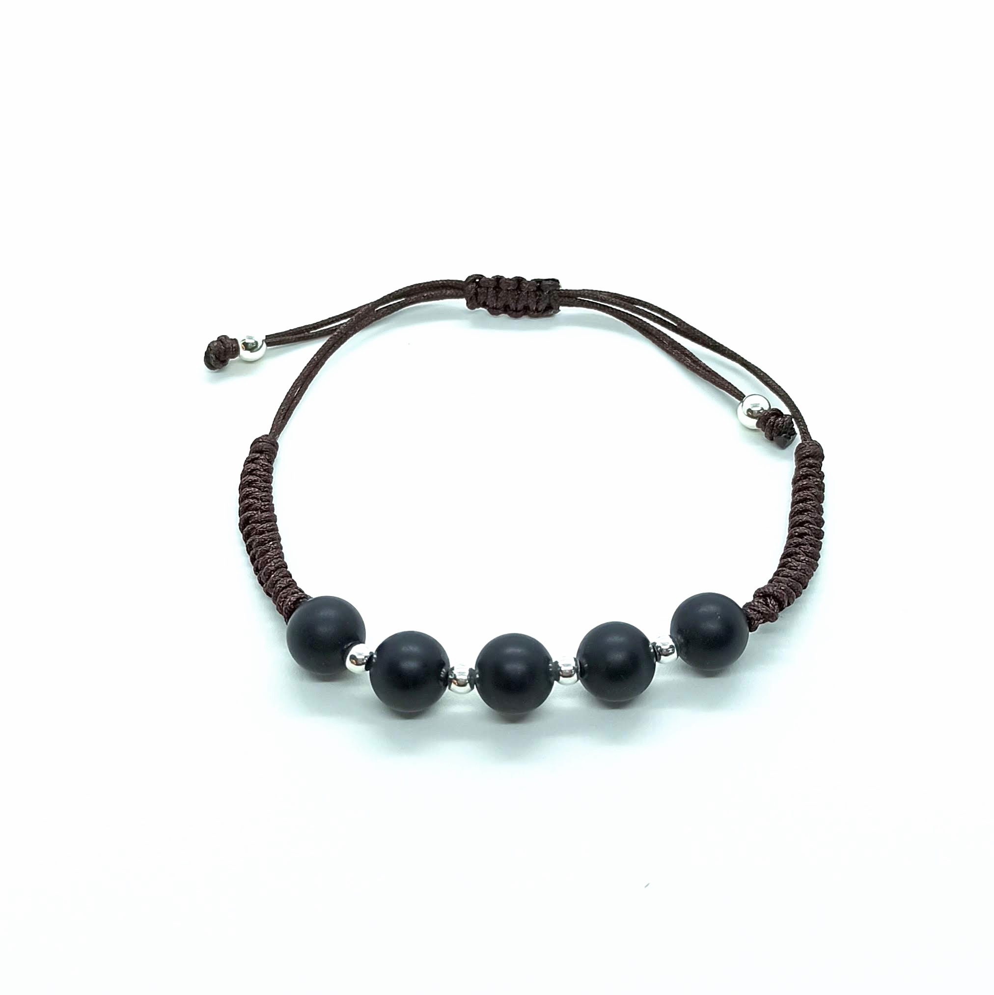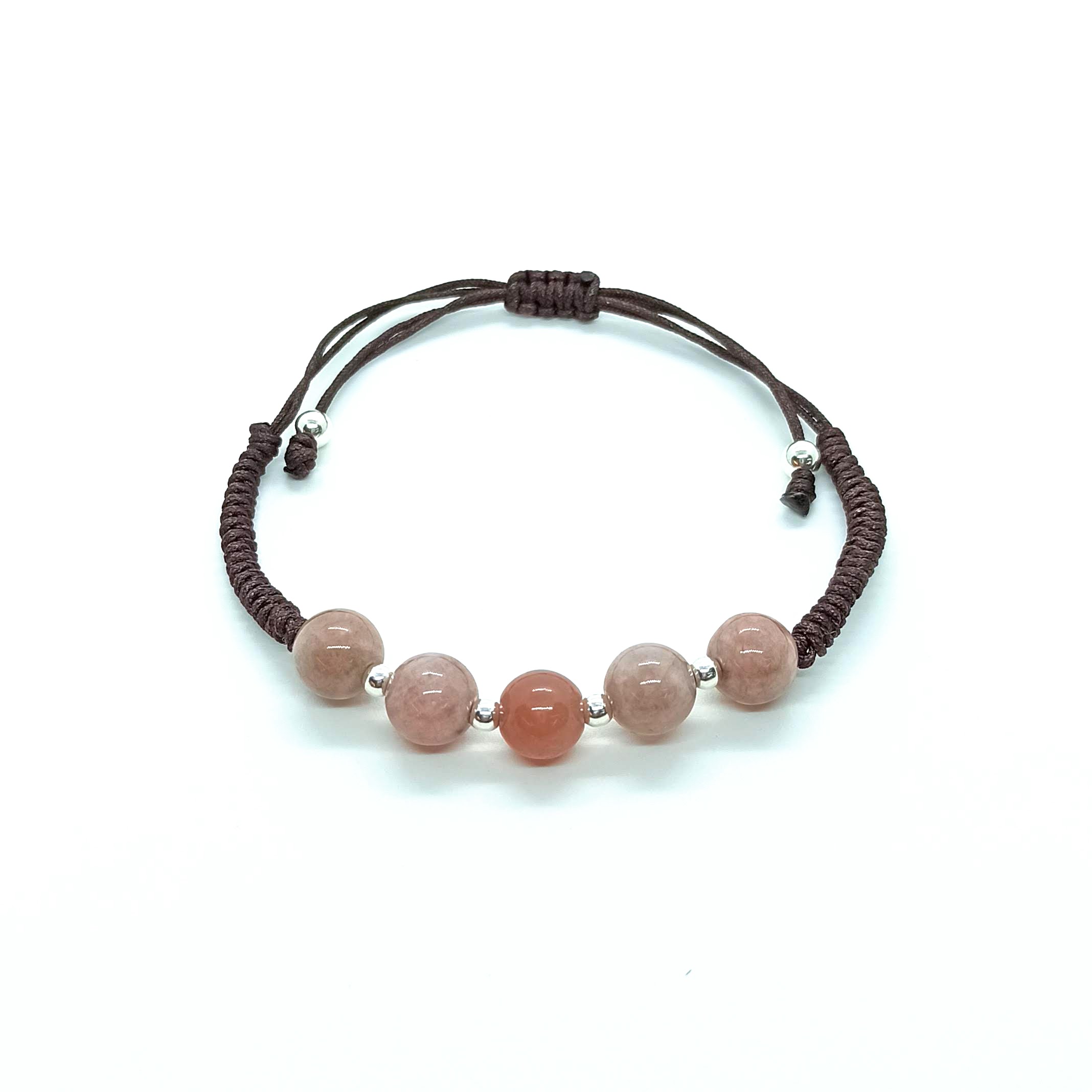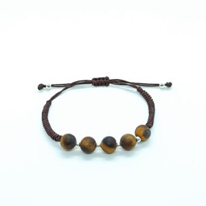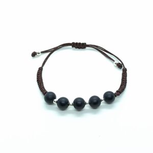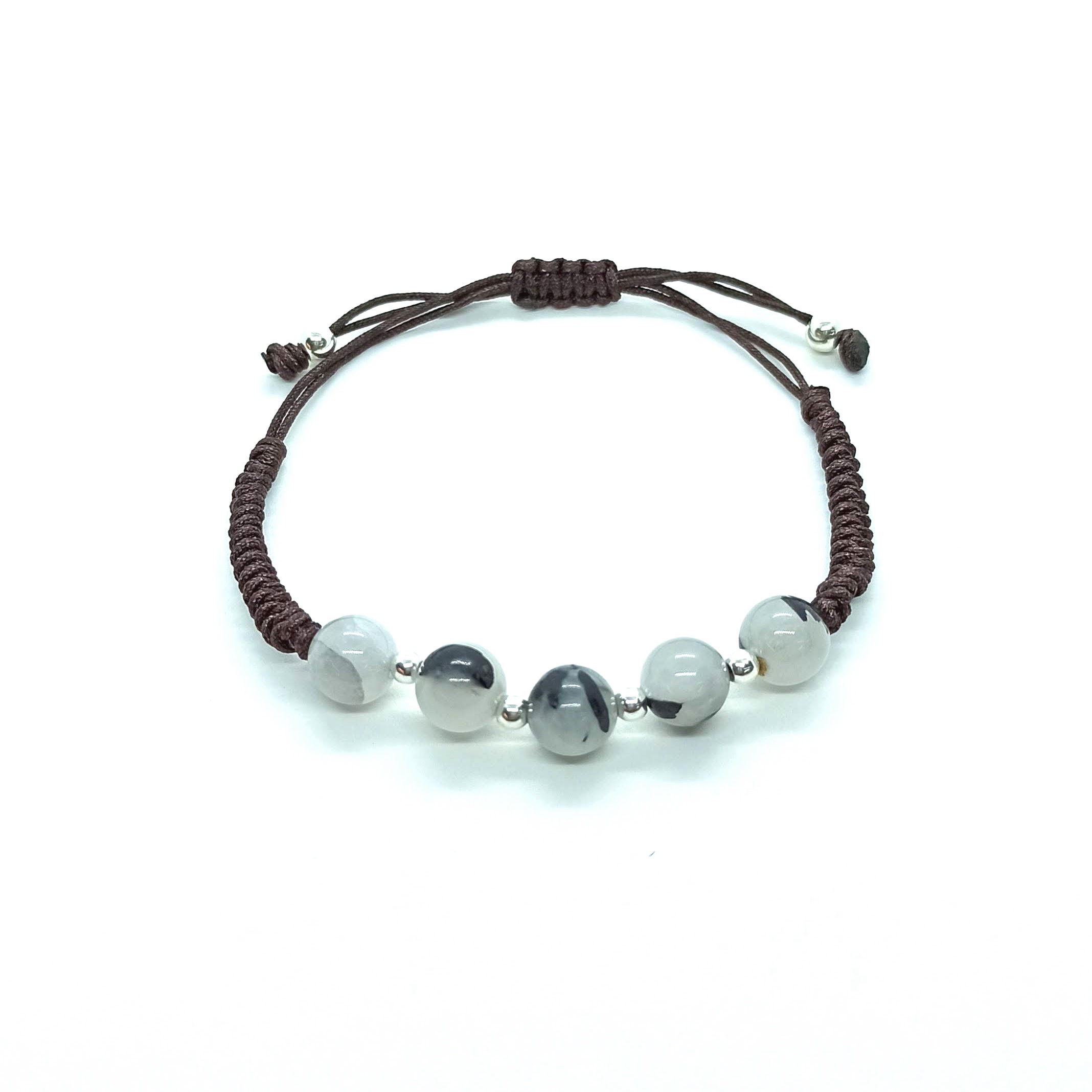 Pulseras de Piedras, enfiladas en hilo marrón con nudos serpiente. En el centro 5 piedras naturales redondas de 0.8 mm. aprox. intercaladas con 4 Bolas de 3 mm. de Plata 925. Cierre con nudos macramé. Acabadas al final de cada hilo con 1 Bola de 4 mm. de Plata 925. Disponible en distintas piedras: Ágata iris, Ágata rosa, Turmalina negra, Ojo de tigre, Cuarzo rutilado, Lapislázuli, Amazonita y Piedra luna. ¡Escoge la que más te guste!